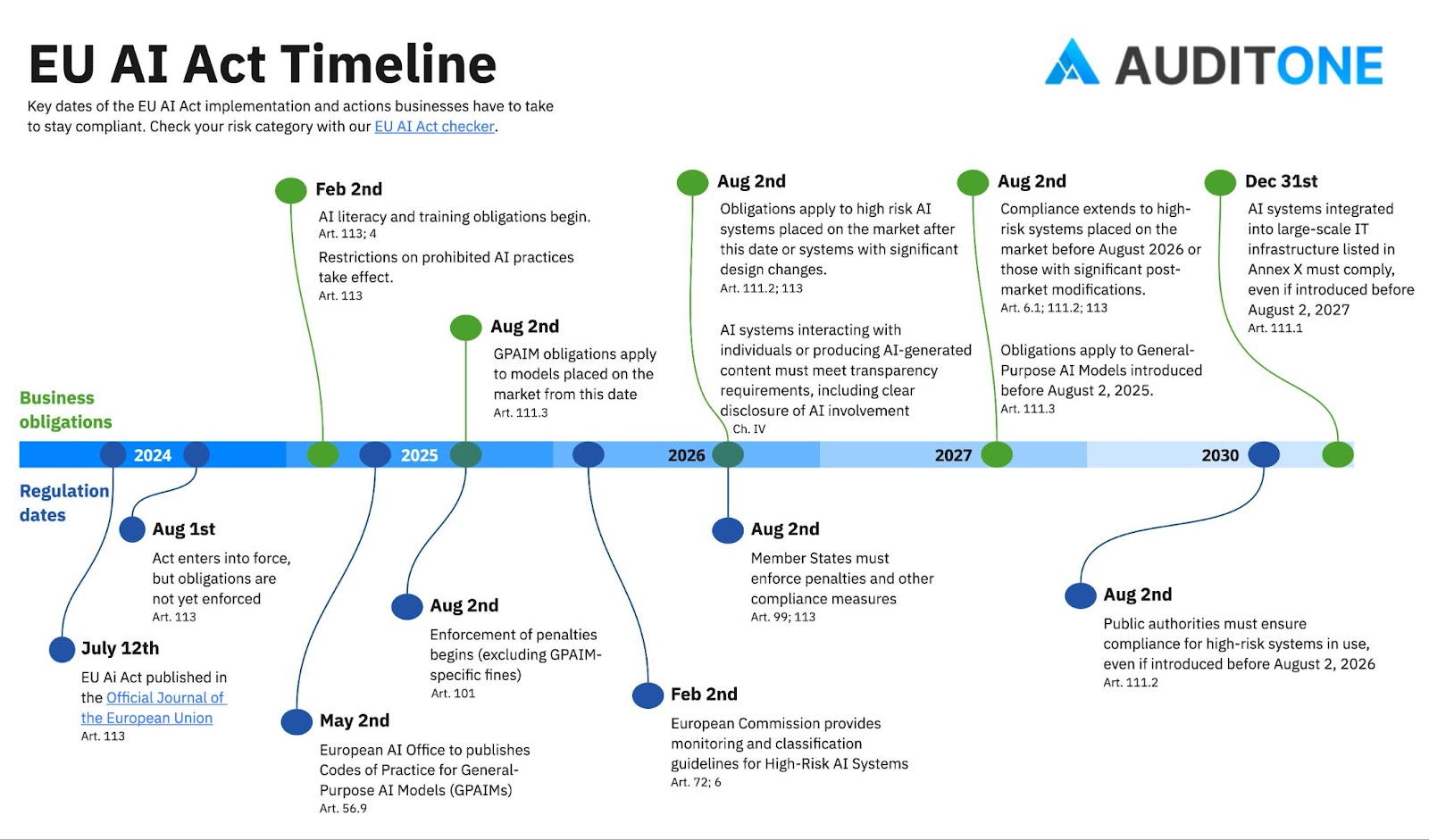 The EU AI Act sets a timeline (see attached) for compliance that begins with foundational governance and moves toward full enforcement over several years. In 2025, several key provisions will come into effect: